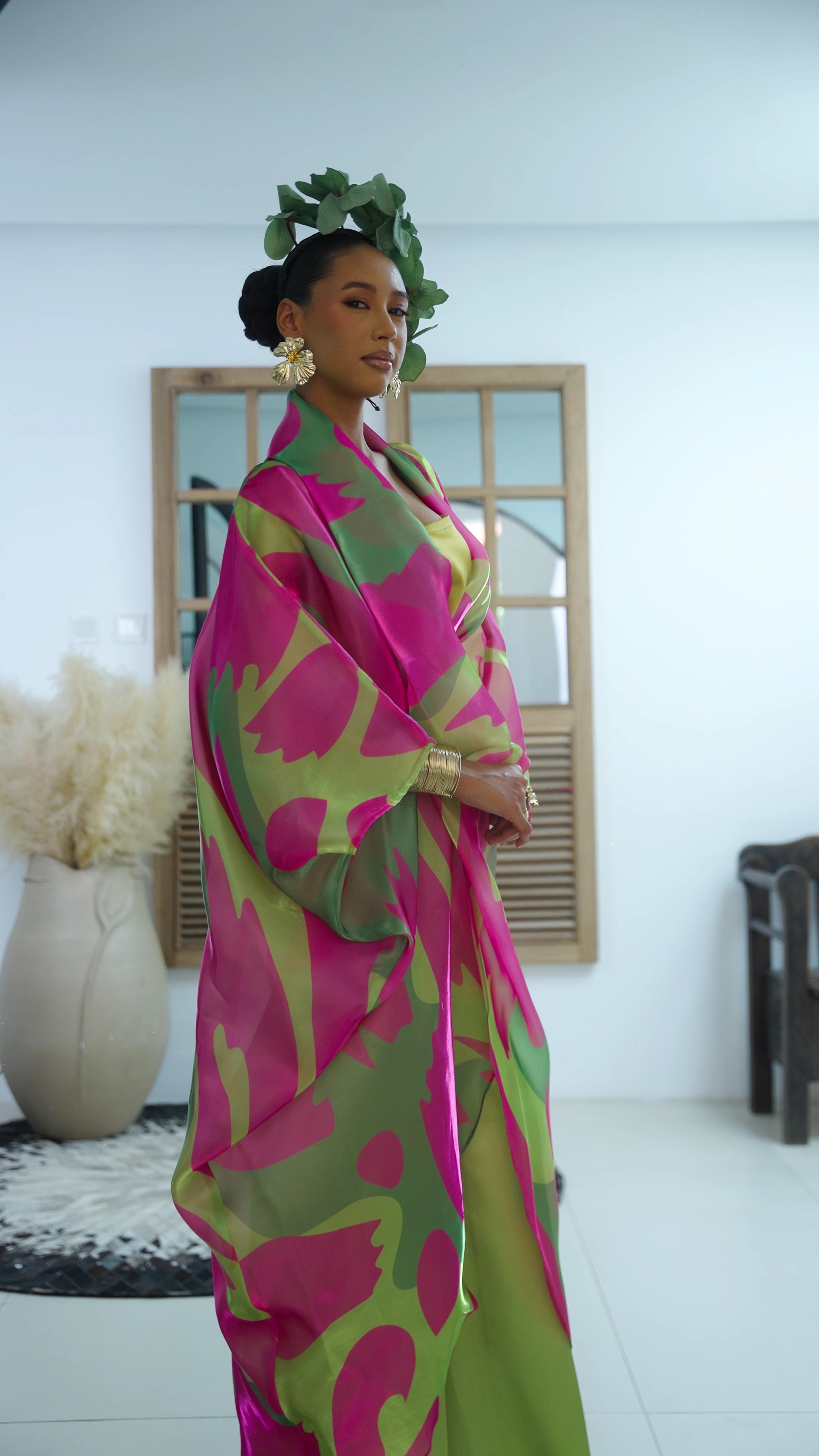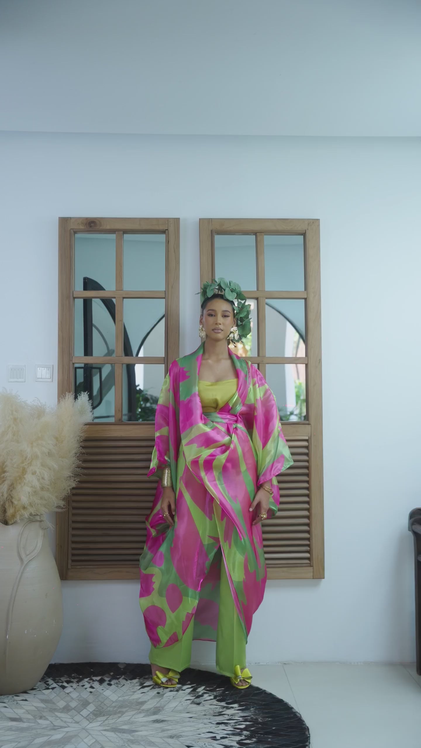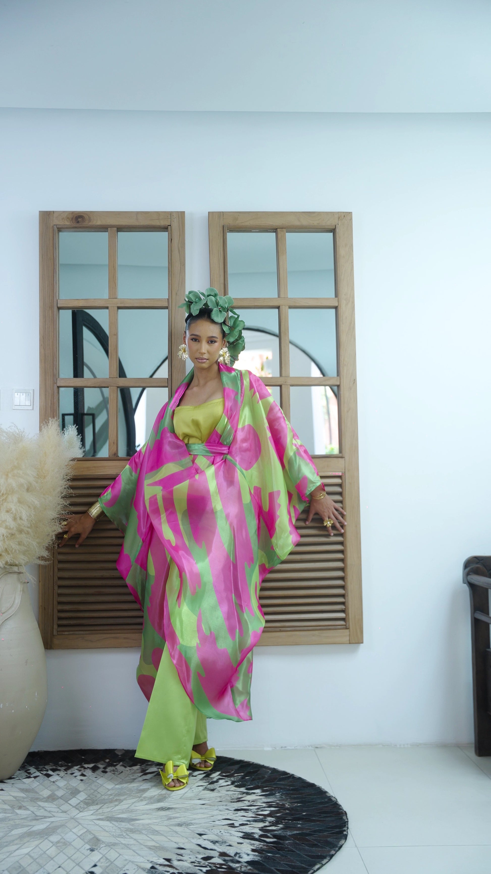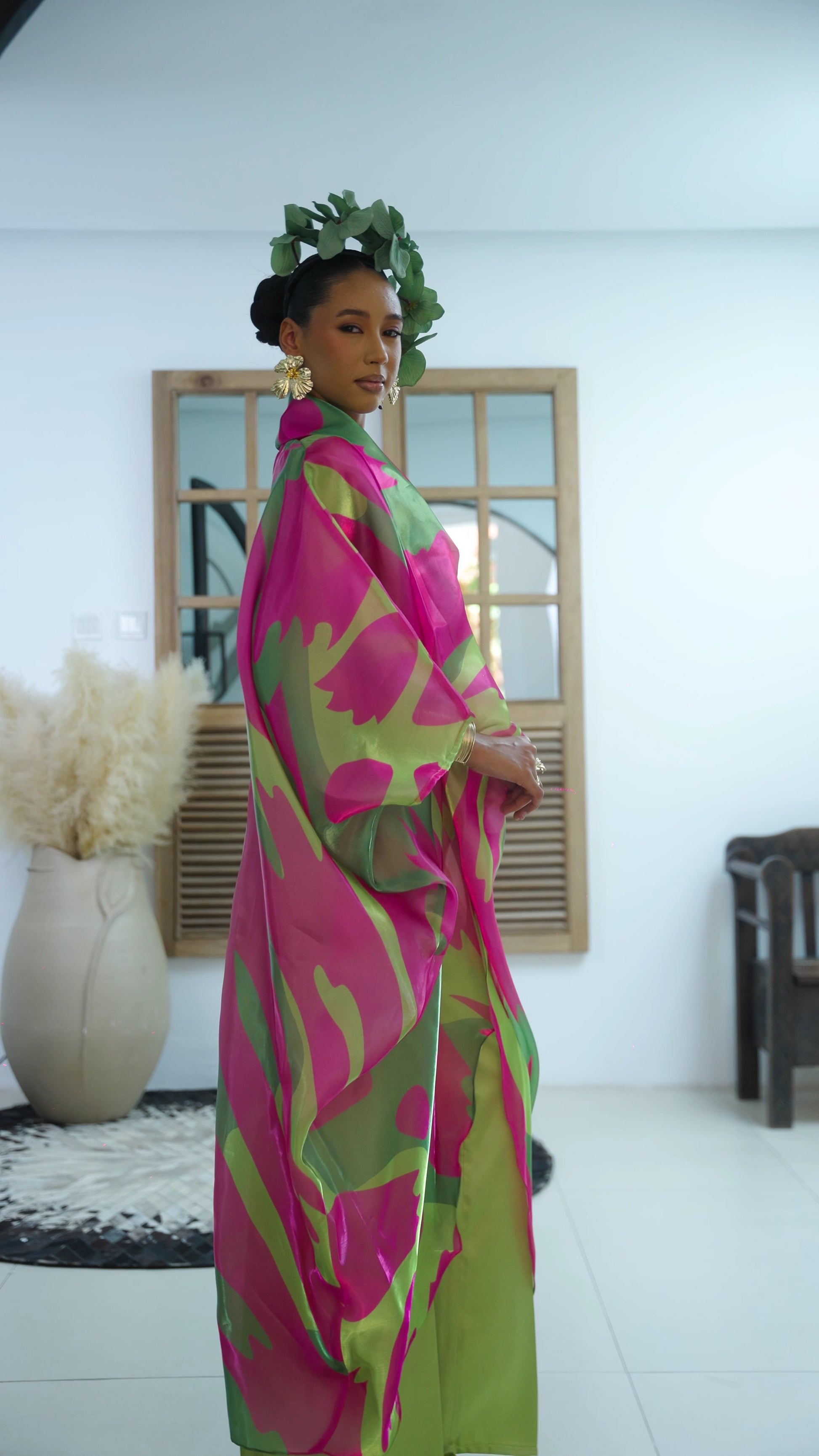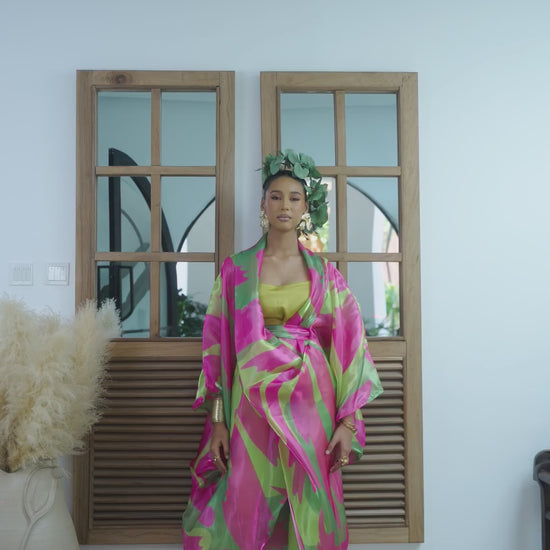 Crafted with a patterned organza robe that features a beautiful glossy finish, it layers perfectly over a simple inner and structured Mikado trousers. The Lina set ensures you'll shine at any daytime celebration or evening event.