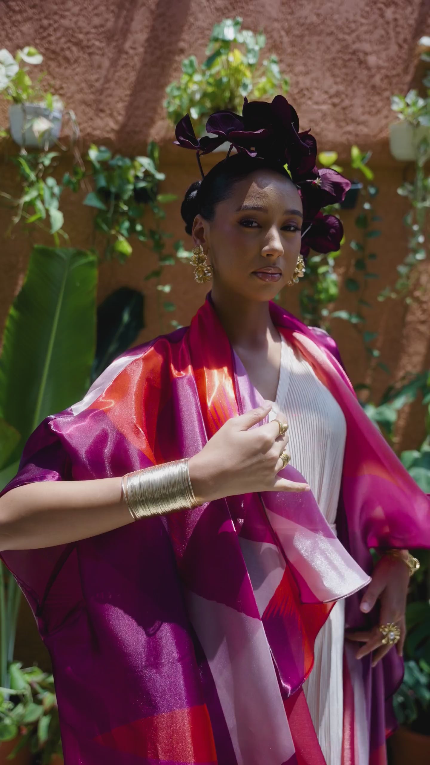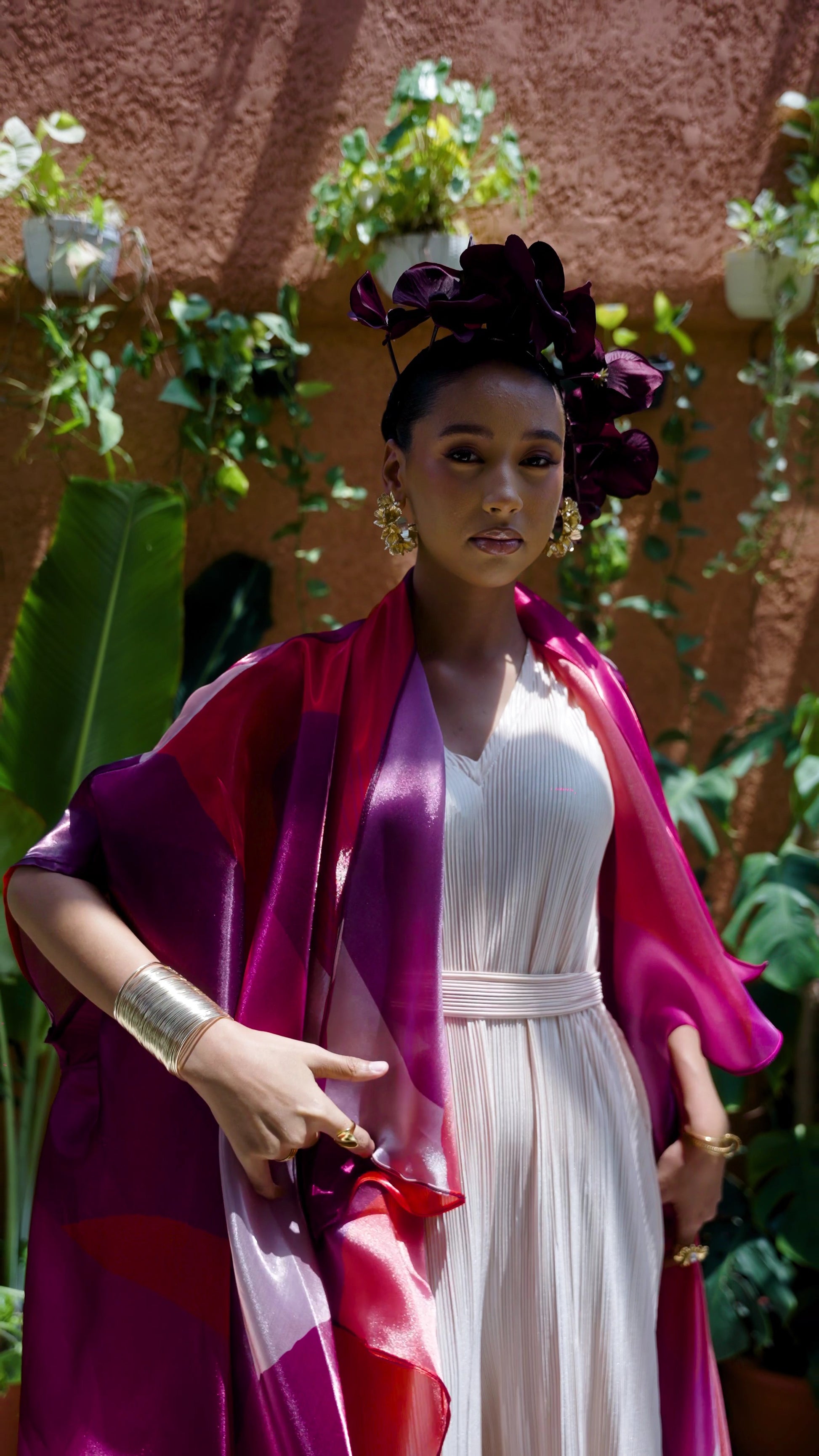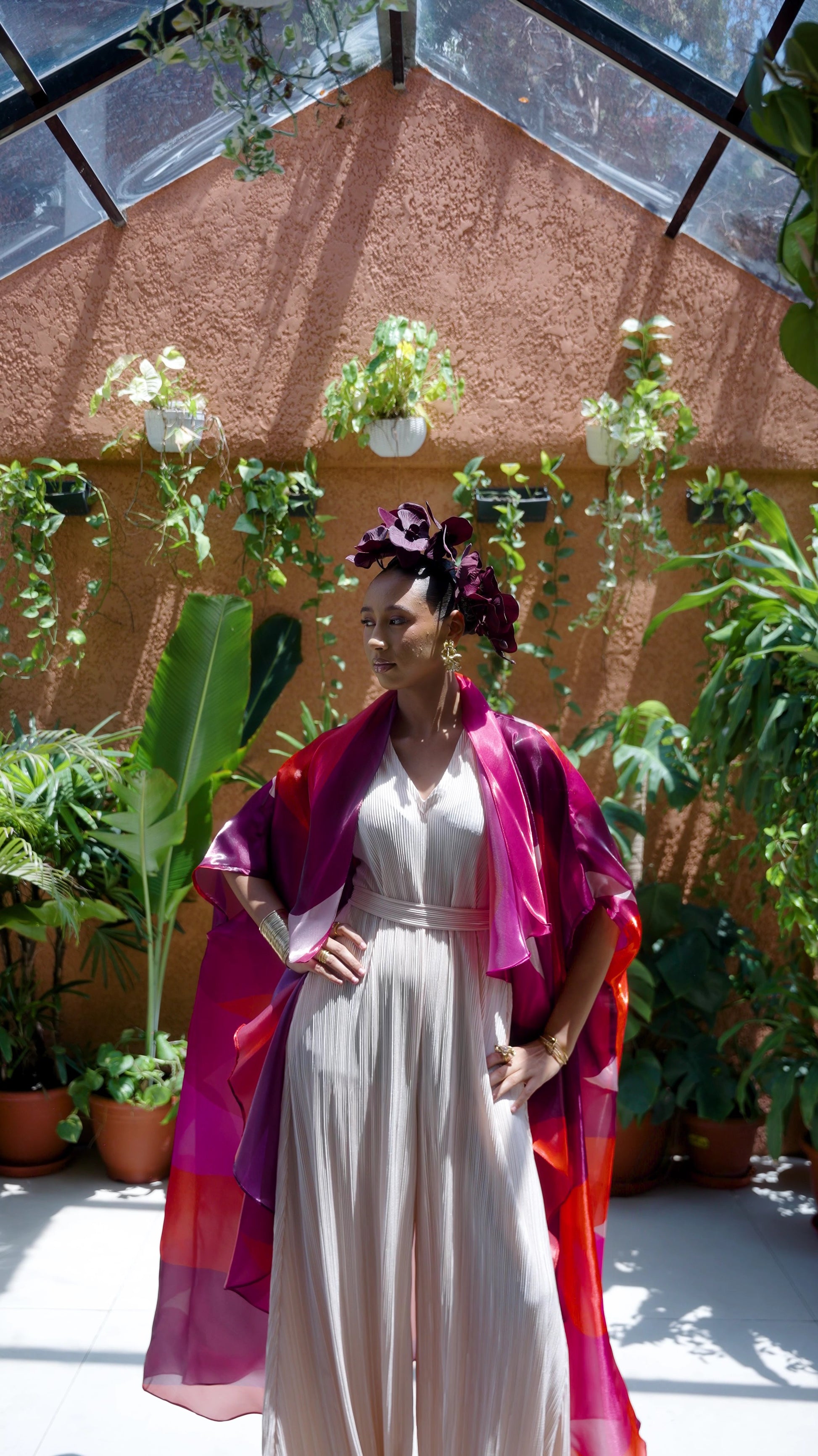 The Talia Set is a stunning two-piece ensemble featuring a patterned kimono and a coordinated nude jumpsuit in luxurious plisse and organdi fabrics. Perfect for parties, events, and weddings, this floral-patterned set flatters all figures with sizes from UK 6 to UK 24. Radiate confidence and elegance in one sophisticated look.