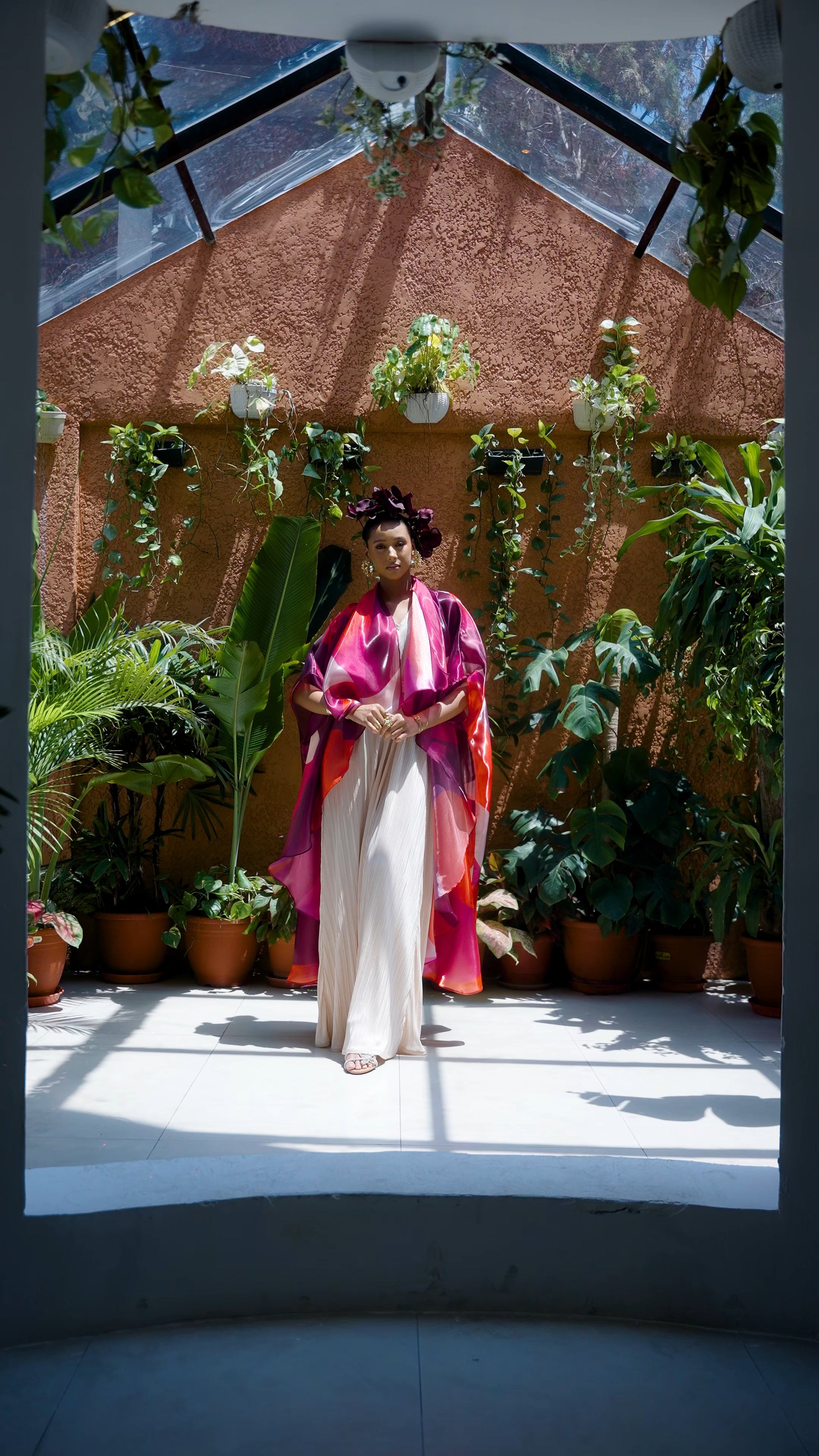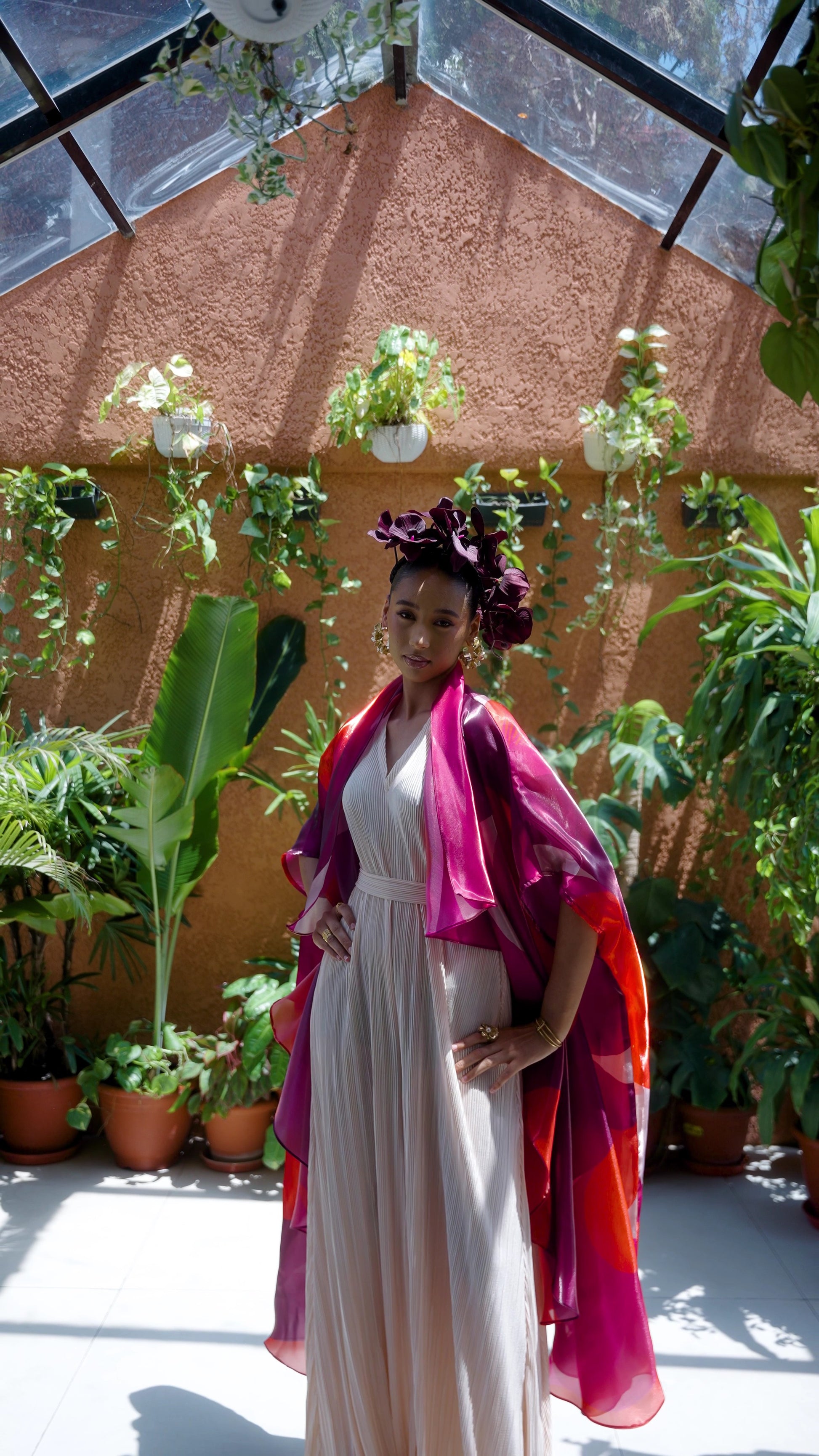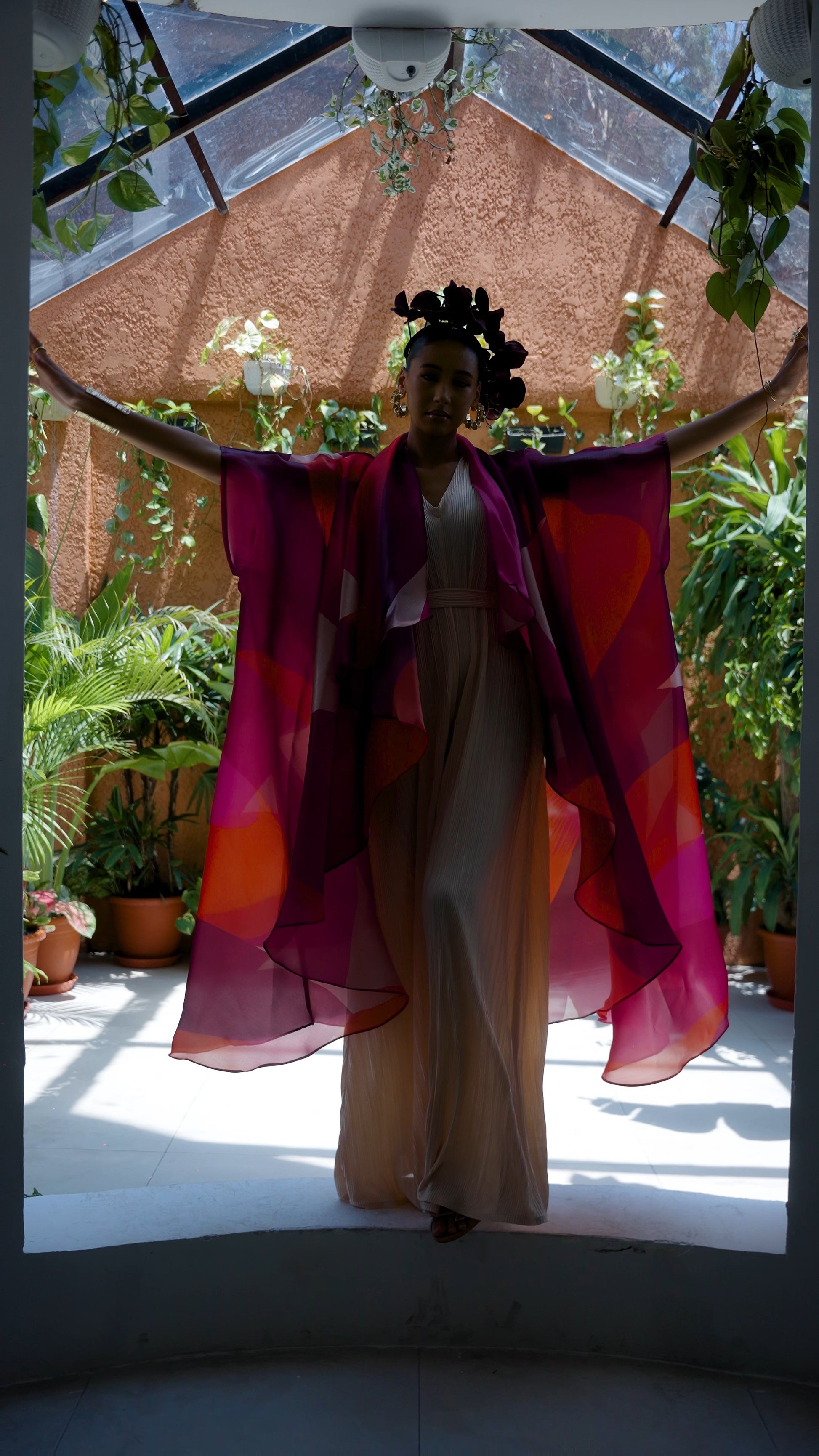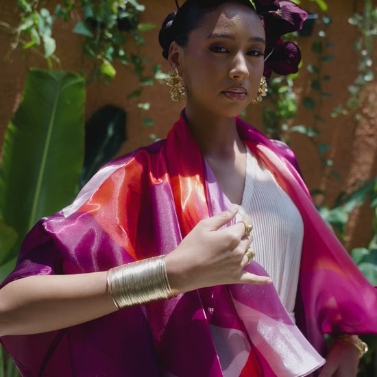 The Talia Set is a stunning two-piece ensemble featuring a patterned kimono and a coordinated nude jumpsuit in luxurious plisse and organdi fabrics. Perfect for parties, events, and weddings, this floral-patterned set flatters all figures with sizes from UK 6 to UK 24. Radiate confidence and elegance in one sophisticated look.