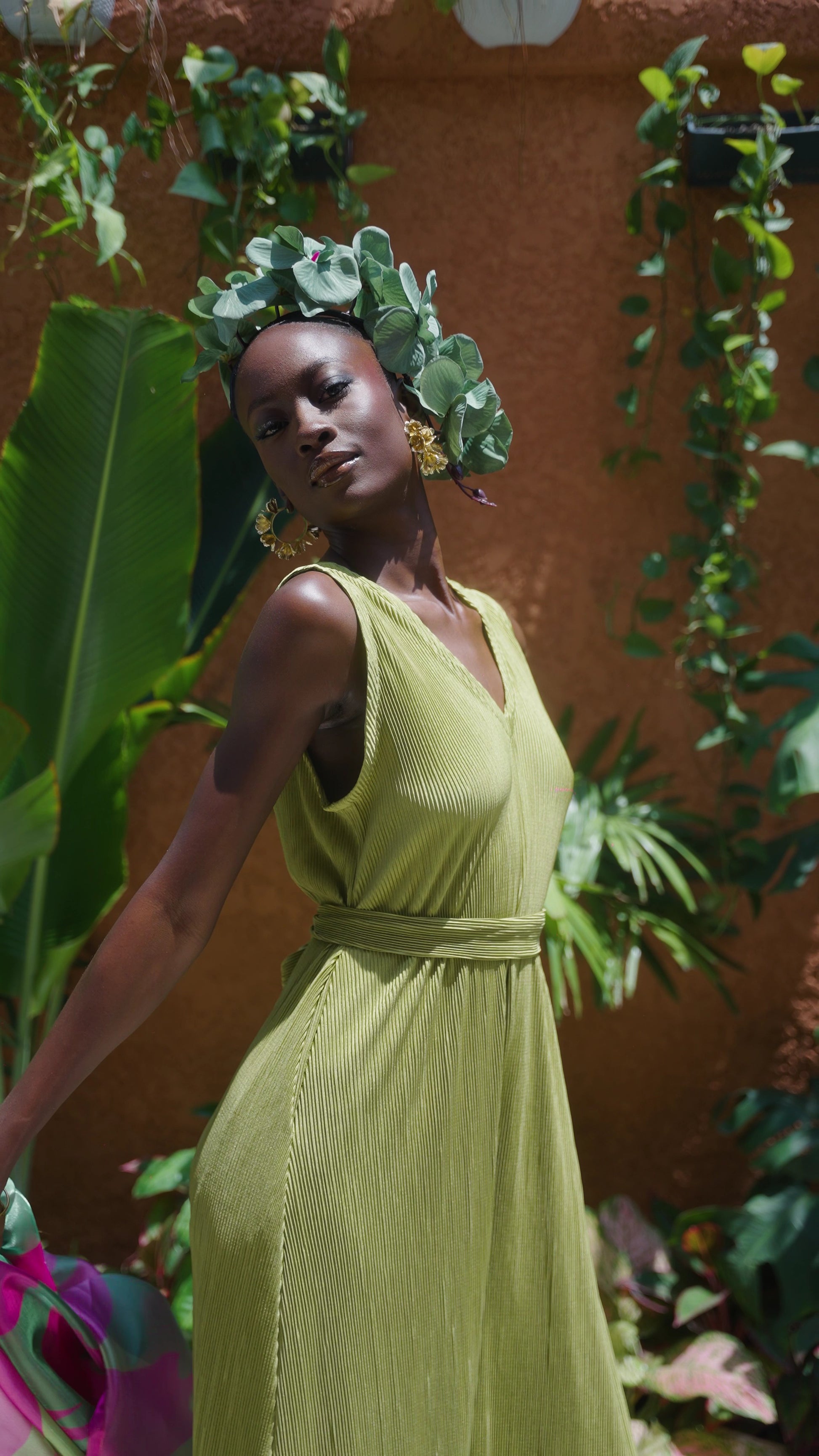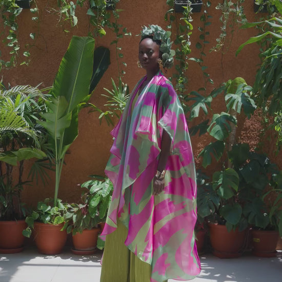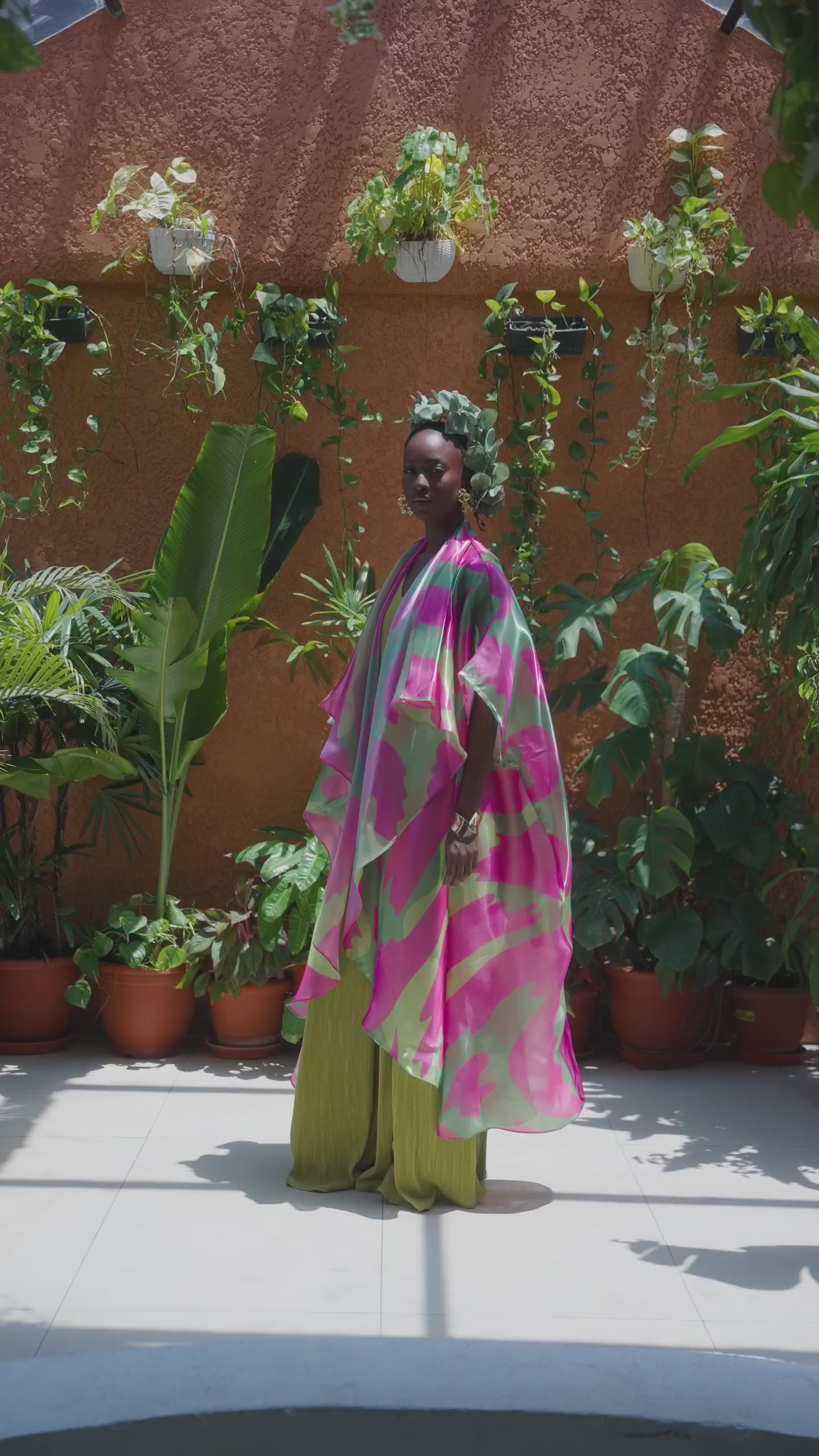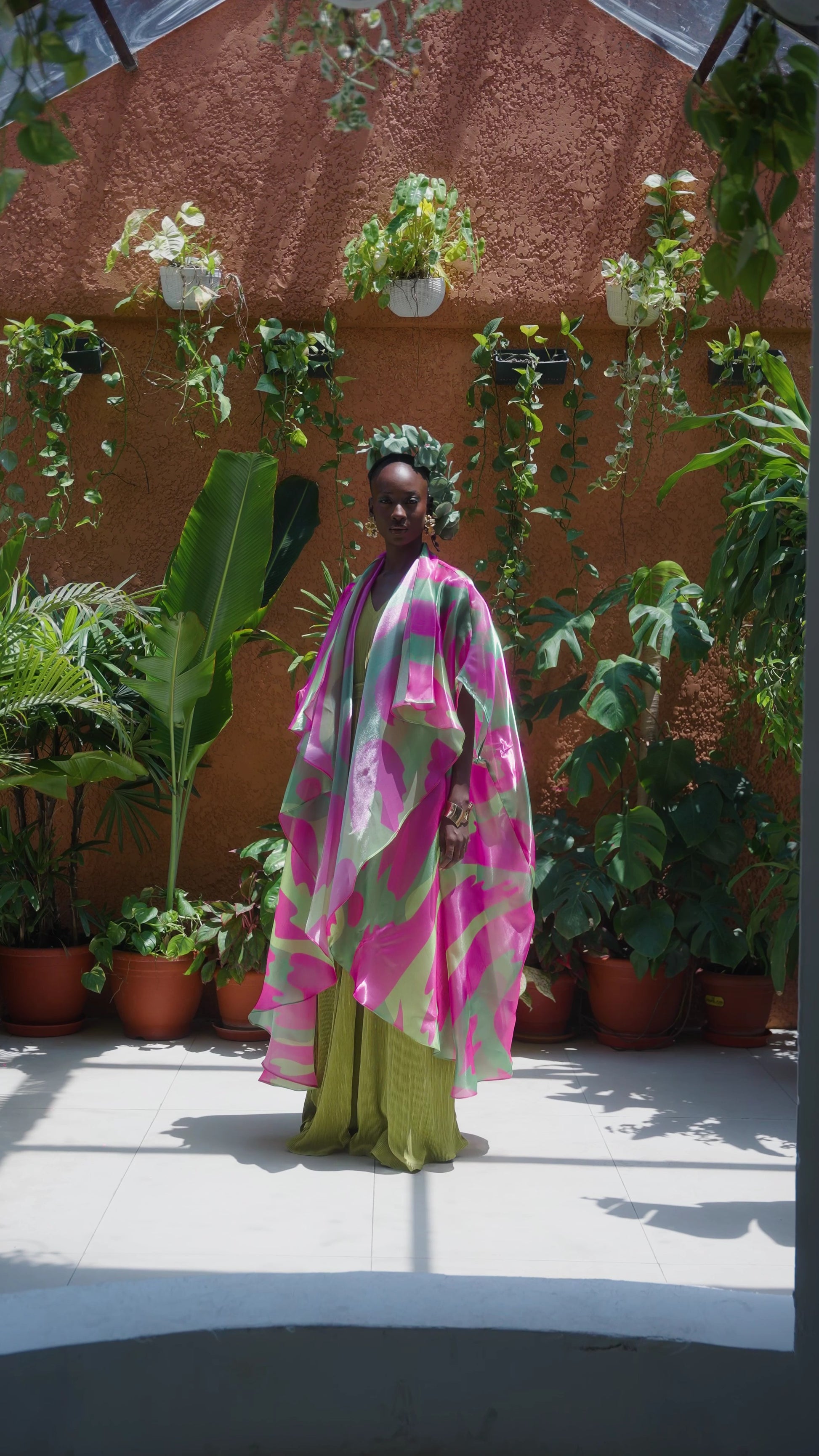 The Soraya Set is a stunning two-piece ensemble featuring a patterned kimono and coordinated olive green jumpsuit in luxurious plisse and organdi fabrics. Perfect for parties, events, and weddings, this floral-patterned set flatters all figures with sizes from UK 6 to UK 24. Radiate confidence and elegance in one sophisticated look.