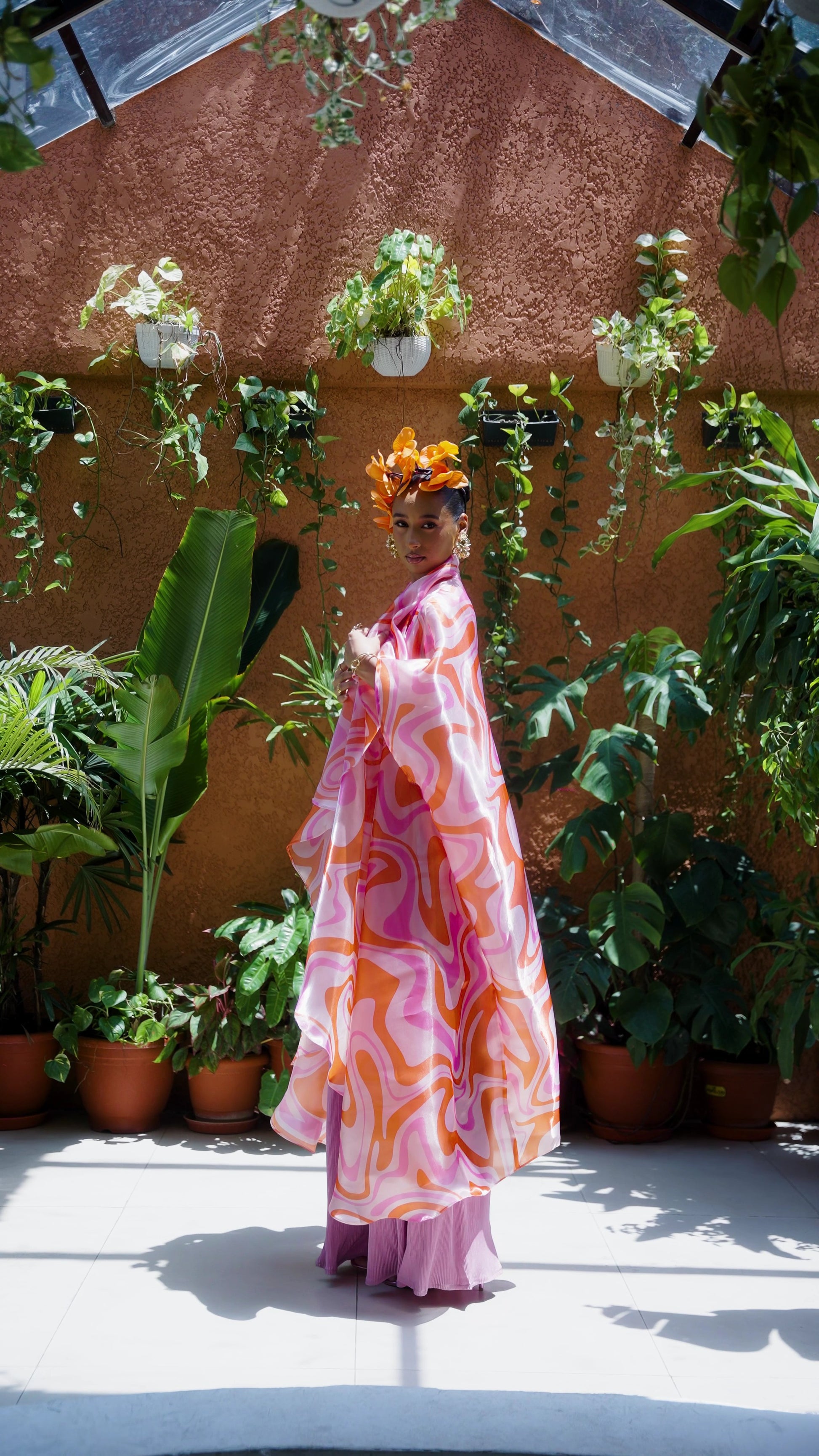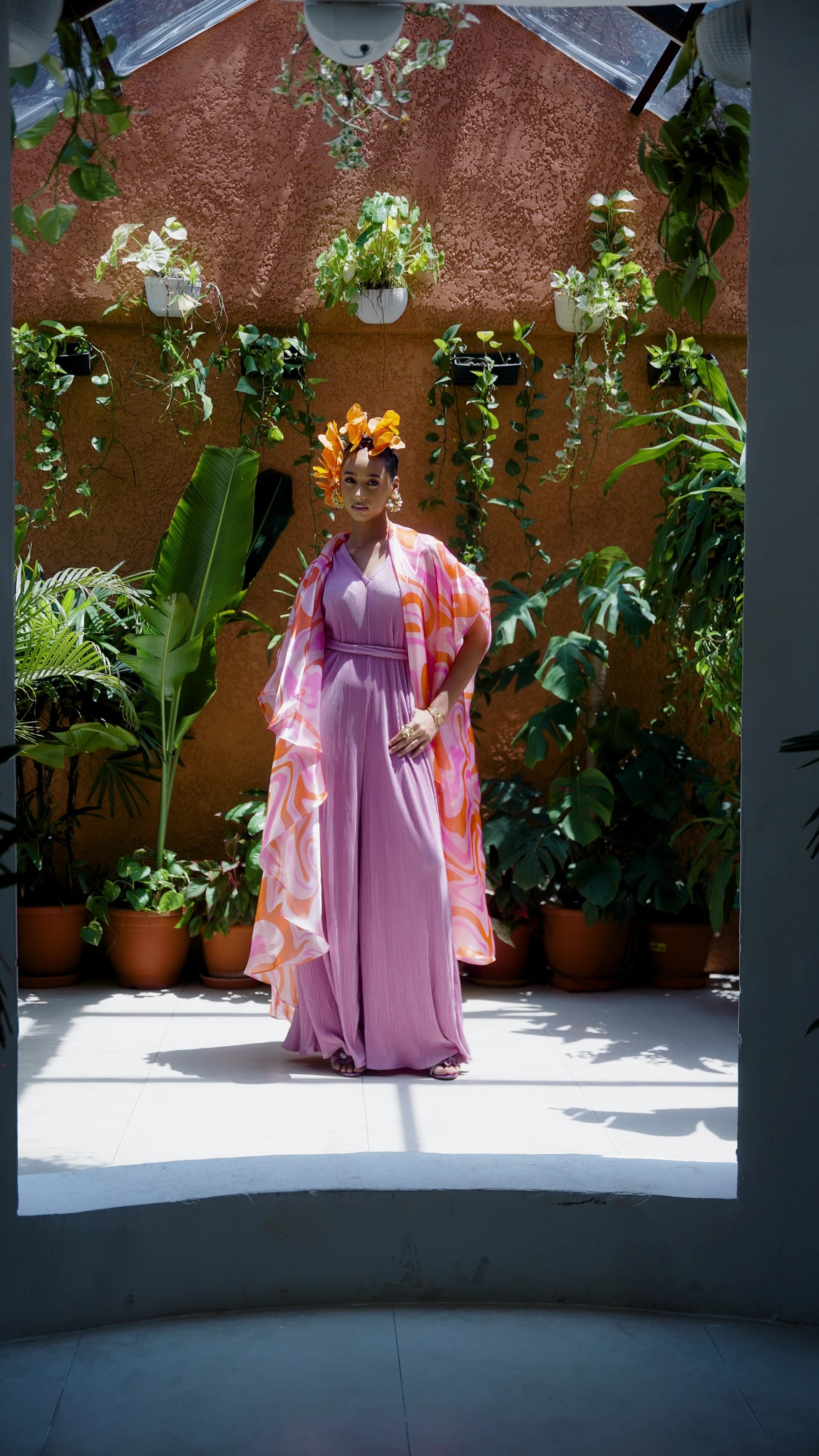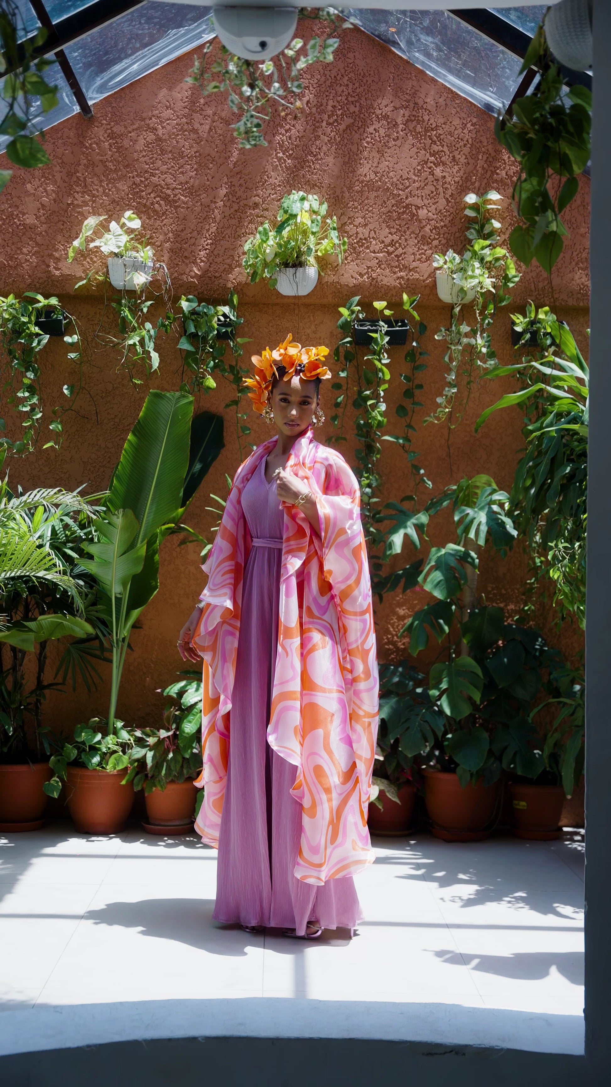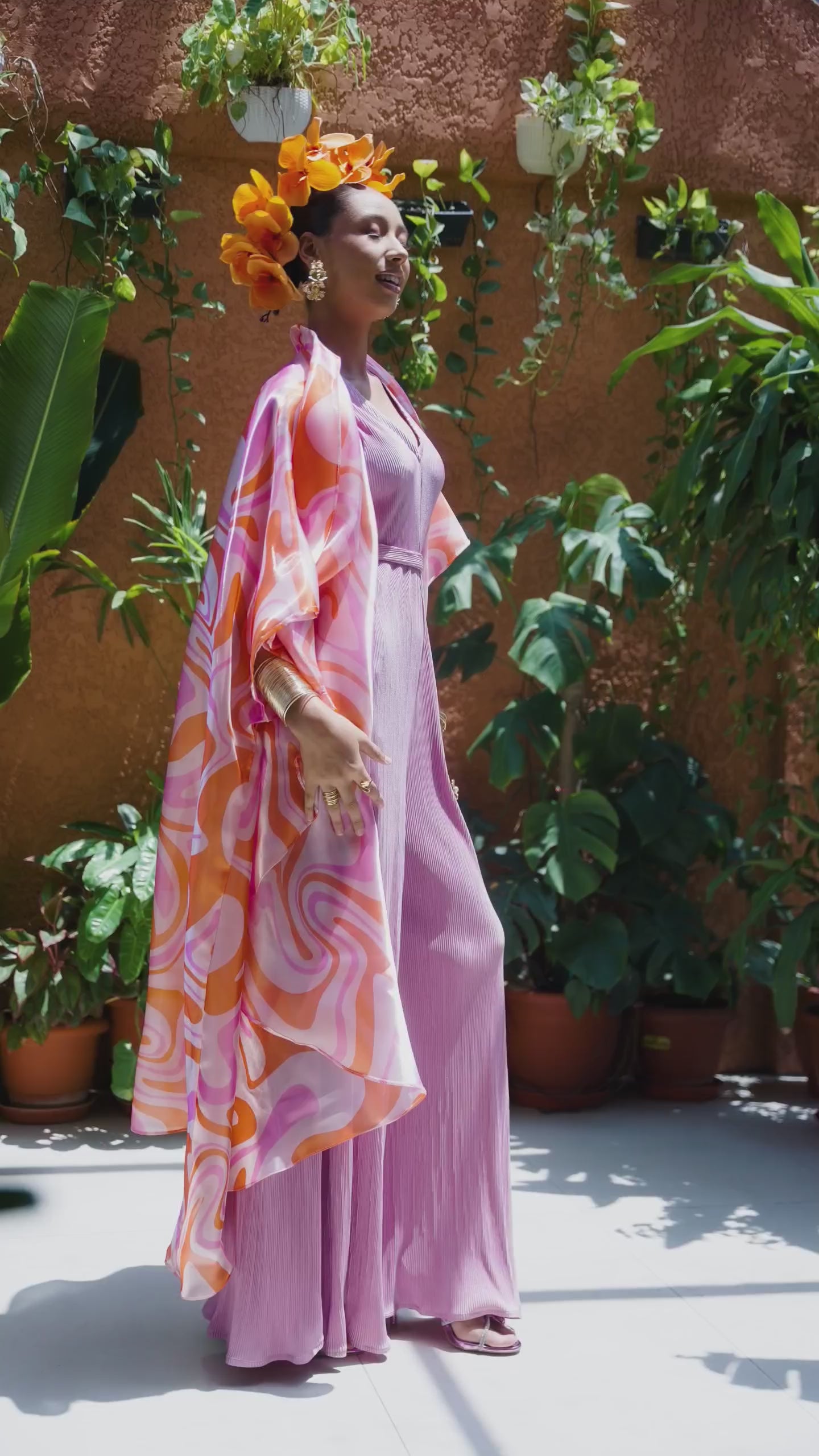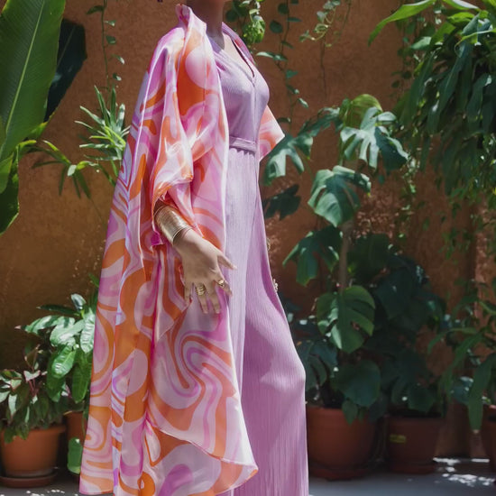 The Jamila Set is a stunning two-piece ensemble featuring a patterned kimono and coordinated onion jumpsuit in luxurious plisse and organdi fabrics. Perfect for parties, events, and weddings, this floral-patterned set flatters all figures with sizes from UK 6 to UK 24. Radiate confidence and elegance in one sophisticated look.