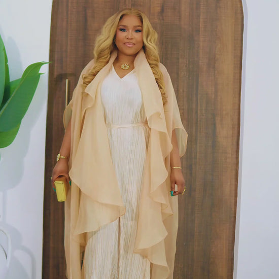 The set features a beautiful inner maxi dress crafted from delicate plissé fabric, offering a graceful, flowing silhouette that flatters every form. This is perfectly complemented by a stunning, draped cape-like top made from lightweight organza, adorned with gentle ruffles that create a soft, ethereal layered effect.
