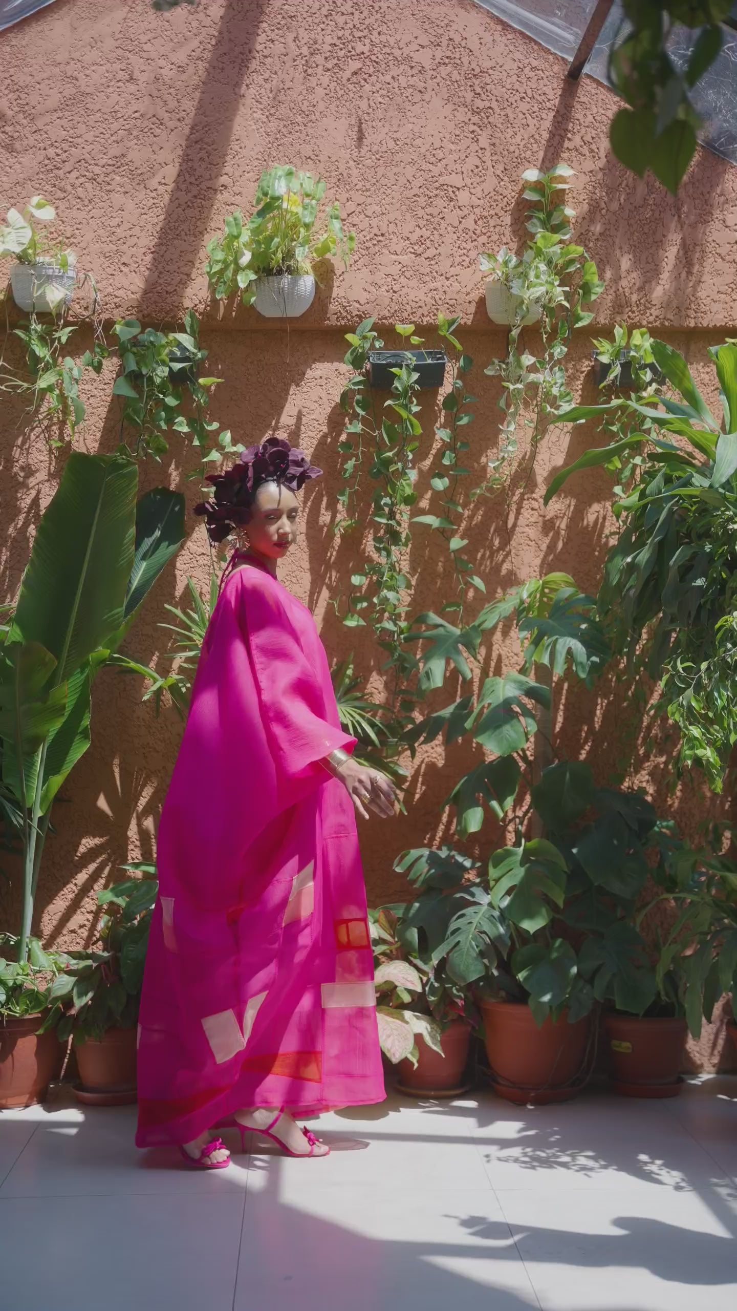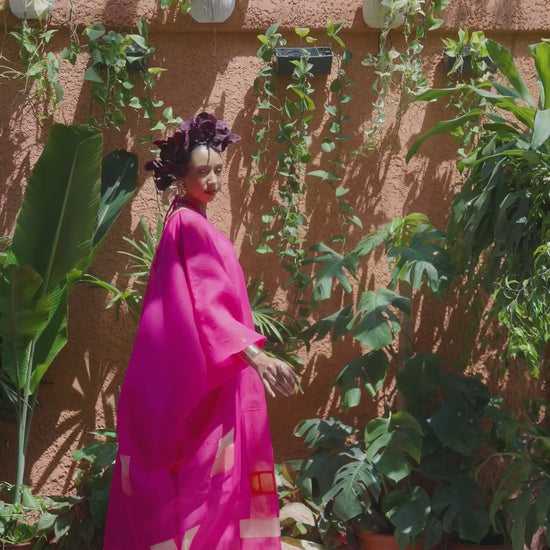 Each piece is meticulously constructed using traditional patchwork techniques and precision tailoring, reimagined for the modern woman who appreciates true craftsmanship. Crafted from luxurious **seersucker fabric** in a timeless **fuschia pink** shade, the Vered Kaftan offers effortless elegance and comfort.